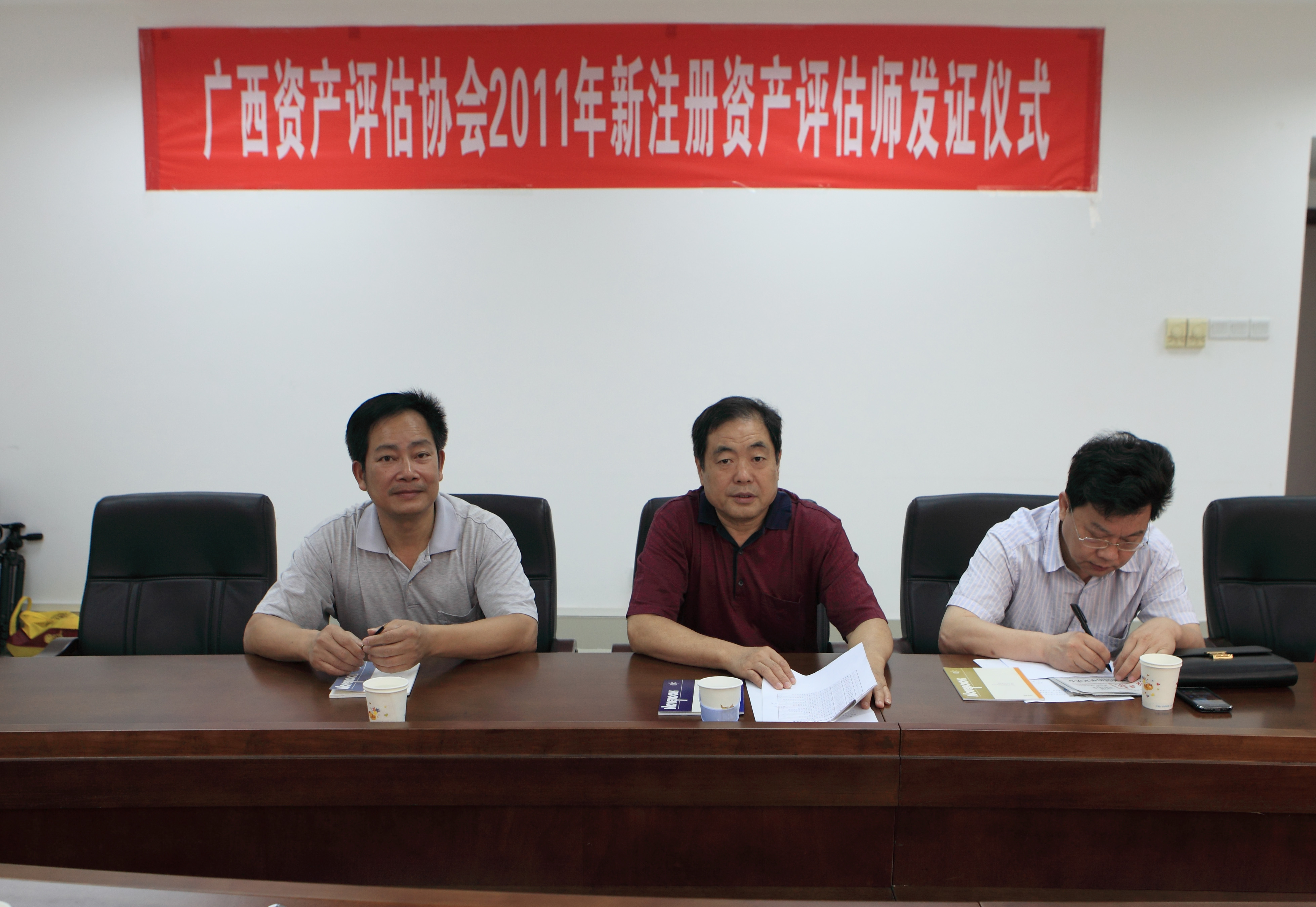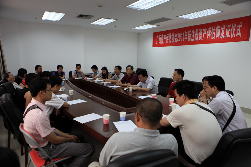 2012年5月14日,广西资产评估协会举行了新注册资产评估师颁发证书仪式。广西资产评估协会会长王保利、副会长王志强、副秘书长黄彩立出席颁证仪式,王保利会长和王志强副会长在仪式上发表了热情洋溢的讲话,并为获得新注册资产评估师的同仁颁发了证书。广西资产评估协会黄彩立副秘书长主持了颁证仪式。