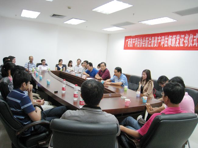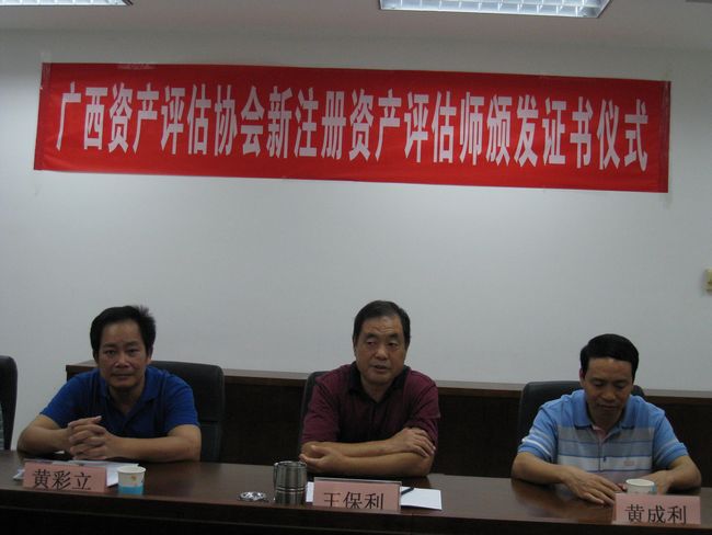 王保利会长在仪式上,首先对获得注册资产评估师证书的同志们表示钦佩和祝贺。他指出,一、在座获得注册资产评估师证书的各位都是经过三年以来不懈的努力,通过严格考试后取得的,而且年轻新评估师考取数量较往年比重增加了,这说明广西评估行业后备力量趋于年轻化,这是可喜的。二、新注册资产评估师要遵守职业道德,培养职业信念,树立诚信、公正、无私的执业精神,按照评估准则要求行事,向老评估师看齐,依靠自身的能力,赢的社会尊重、赢得诚信声望、提高行业公信力。三、今后检查工作底稿方面,明年将以评估报告为准,争取抽查每位评估师的一份报告,以此为依据培养和评选出评估界优秀评估师专家并令其脱颖而出,提高个人评估师的地位,体现竞争公平性,扩大评估行业社会影响力,促进执业环境优化,提高社会对评估的深入认识。