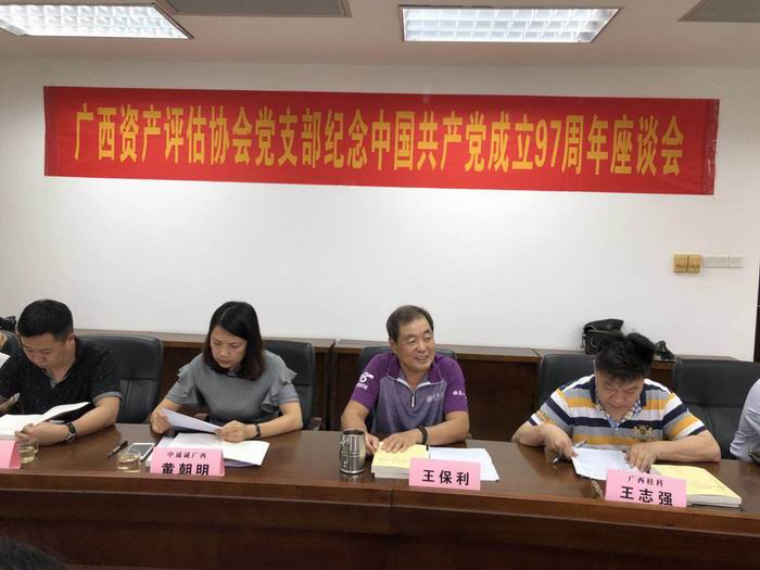 6月29日,为喜迎建党97周年,广西资产评估协会党支部召开迎“七一”党员座谈会。协会会长、党支部书记王保利同志参加会议并讲话,座谈会还邀请了部分驻邕评估机构的党员代表参加。